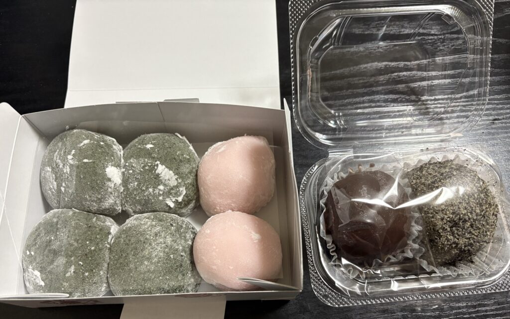 緑=草大福(こしあん)×4、赤=赤大福×2。右の2つはおはぎ(あん/ごま)。